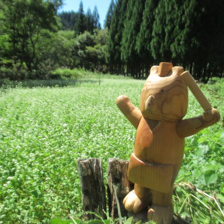 そばの花も綺麗に咲き、実りの頃を待つばかりです。 鳩がそばの実を食べに来ています。 天気が良いので、権兵衛のマスコット「てるきち君」 そば畑で・・・ ハイ!ポーズ(^o^)丿 沢山収穫できればいいのにな~~